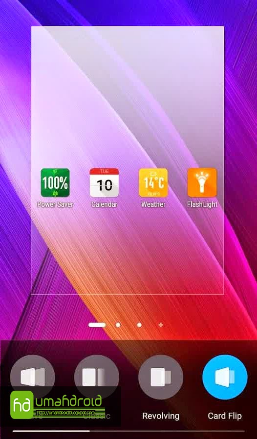 Dalam ZenUI yang saya share ini sudah termasuk fitur mengganti icon, transisi efek yang lebih variatif, mengganti folder dsb. Ini lah tampilannya :