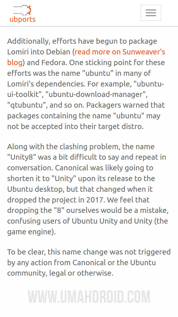 Faktor terakhir, UBports juga mengatakan jika perubahan nama dapat meningkatkan komunikasi verbal. Orang sudah tidak perlu khawatir lagi ketika menyebut Unity (Ubuntu) dan Unity (Game Engine).